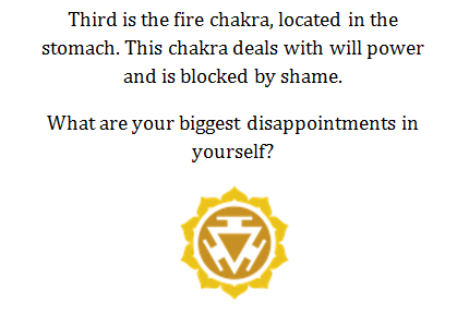 When we have shame and disappointment in ourselves, we have blockage in the third chakra or the Solar Plexus chakra. Strategies in balancing the third chakra is risk taking, grounding, emotional contact, deep relaxation, stress control, vigorous exercise, sit-ups, and psychotherapy (release or contain anger, build ego strength, work on shame issues, strengthen will). Infinite love and light, Brooke (Copyright 2013 Kundalini Spirit with All Rights Reserved)